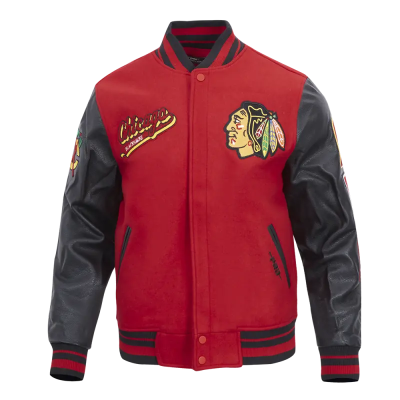 NHL CHICAGO BLACKHAWKS RETRO CLASSIC MEN’S RIB WOOL VARSITY JACKET (BLACK\/RED\/BLACK)