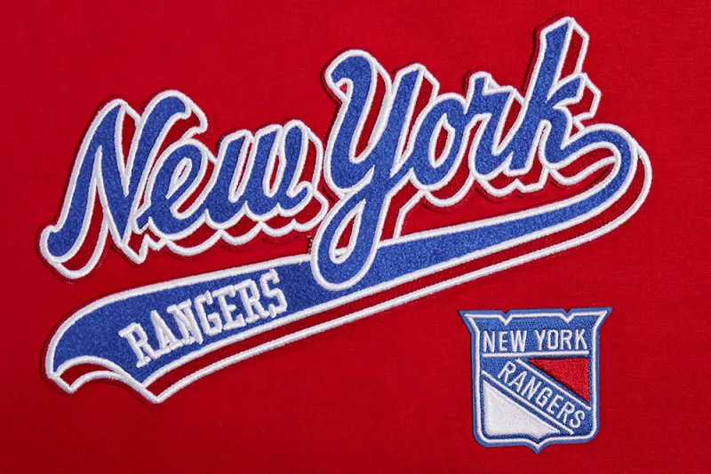 Home / Shop / SWEATSHIRTS / NHL NEW YORK RANGERS SCRIPT TAIL WOMEN’S RIB FLEECE CROPPED PULLOVER HOODIE (RED)