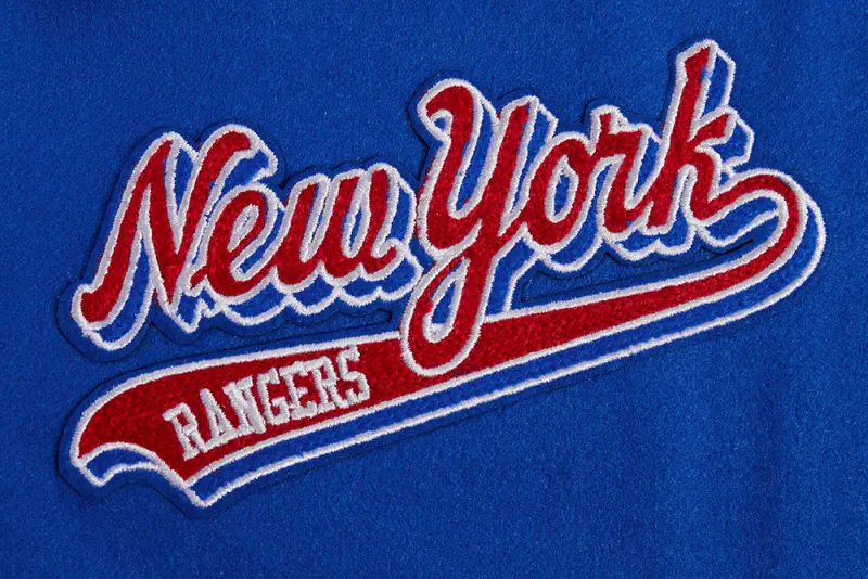 NHL NEW YORK RANGERS SCRIPT TAIL WOMEN’S WOOL VARSITY JACKET (ROYAL BLUE\/RED)