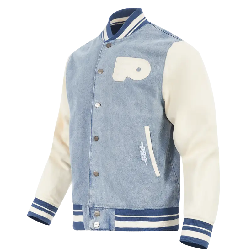 Home / Shop / JACKETS / NHL PHILADELPHIA FLYERS VARSITY BLUES MEN’S DENIM VARSITY JACKET (DENIM\/LINEN)